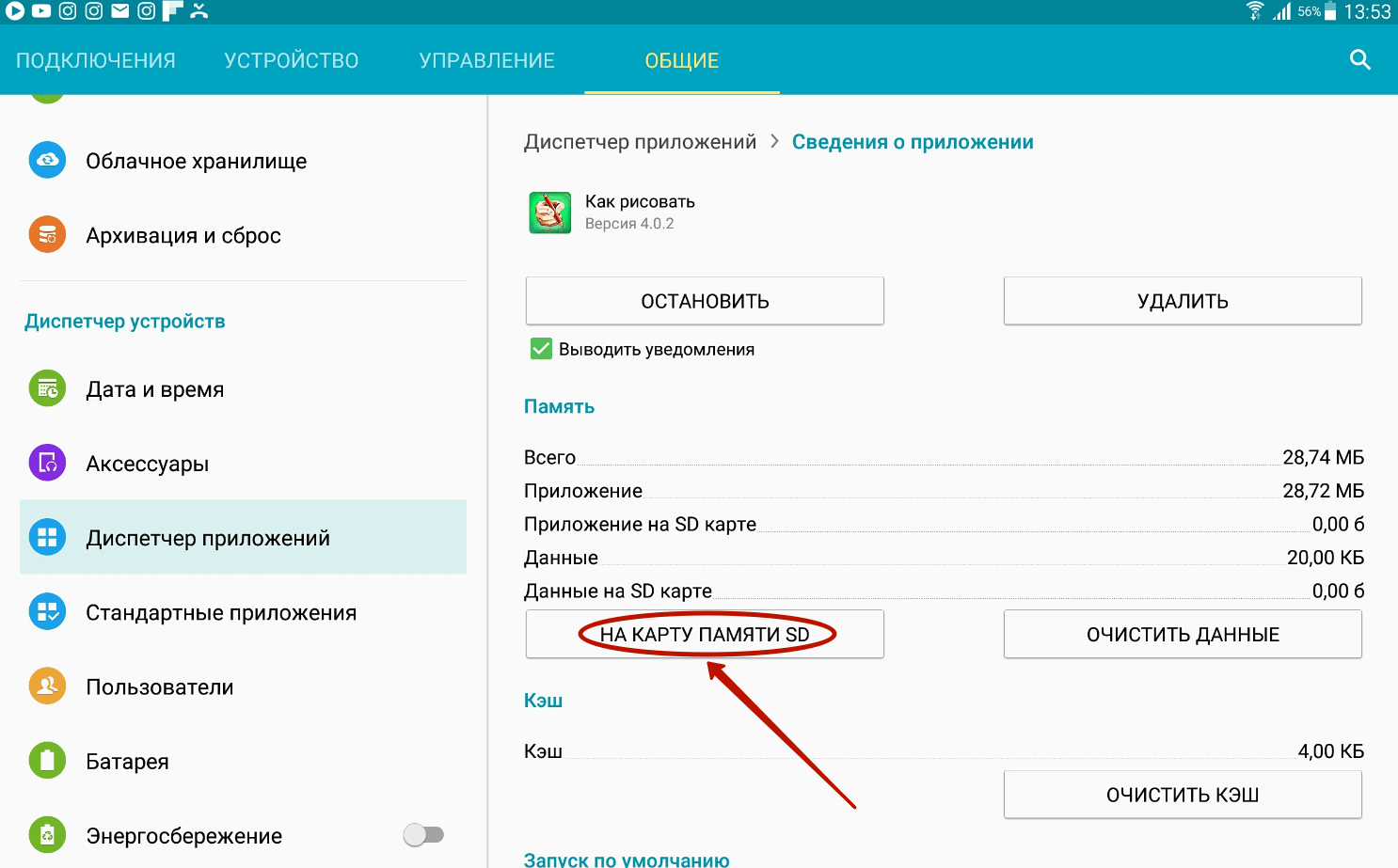 Шаг 2. Зайдите в раздел «Диспетчер приложений ». Также он может называться «Приложения ». Если у вас планшет, то предварительно необходимо переместиться во вкладку «Общие ».