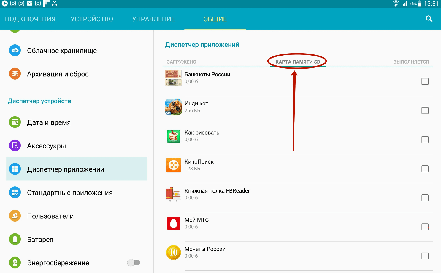 Шаг 3. Перейдите во вкладку «Карта памяти SD ». Здесь отображаются все программы и игры, которые можно переместить на внешнюю память.